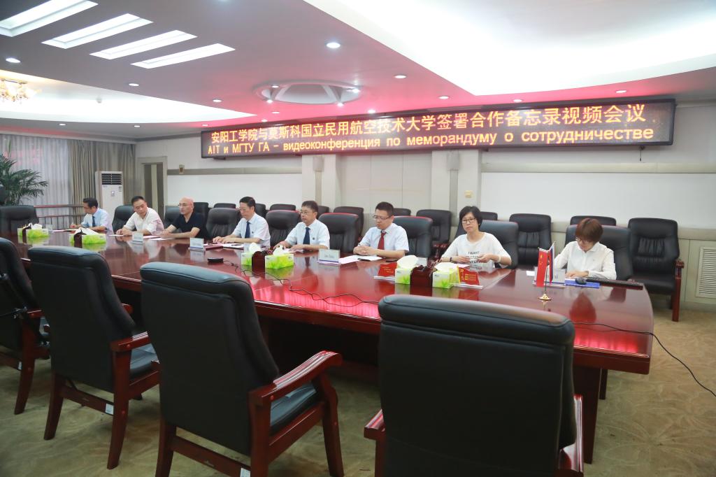 6月16日下午,我校在行政楼二楼会议室与俄罗斯莫斯科国立民用航空技术大学举行签署合作备忘录线上视频会议。我校校长景国勋、副校长万鹏杰,莫斯科国立民用航空技术大学校长叶丽塞耶夫、副校长伊莉娜、博洛索瓦,中方代表大卫出席会议,校长办公室、教务处、国际合作与交流处等相关部门负责人参加视频会议。副校长万鹏杰主持会议。