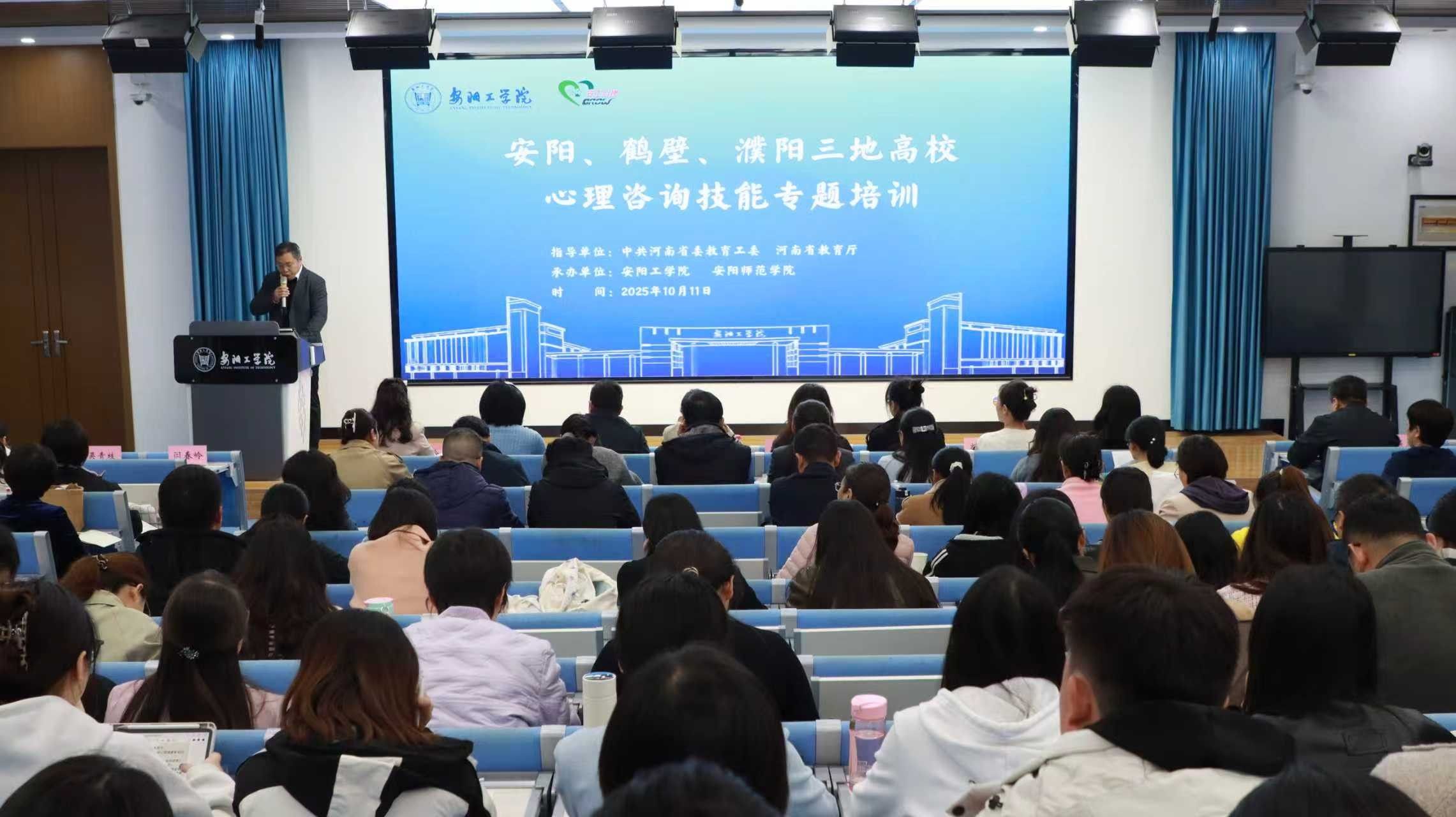 10月11日下午,在省委教育工委、省教育厅指导下,由我校承办的安阳、濮阳、鹤壁三地高校心理咨询技能专题培训顺利举办。副校长闫春岭出席培训并致辞。北京师范大学心理学部教授张澜作为特邀专家出席培训。来自安濮鹤三地十余所高校的专兼职心理咨询师、学工队伍、辅导员等近200人参加培训。