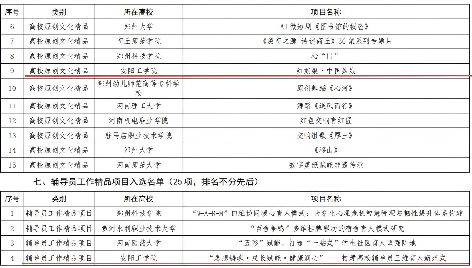 近日,中共河南省委教育工委、河南省教育厅公布2025 年河南省高校思想政治工作质量提升综合改革与精品建设项目入选名单,校团委的舞台剧《红旗渠・中国姑娘》入选高校校园原创文化精品项目,计算机科学与信息工程学院许研主持的《“思想铸魂・成长赋能・健康润心”——构建高校辅导员三维育人新范式》入选辅导员工作精品项目。