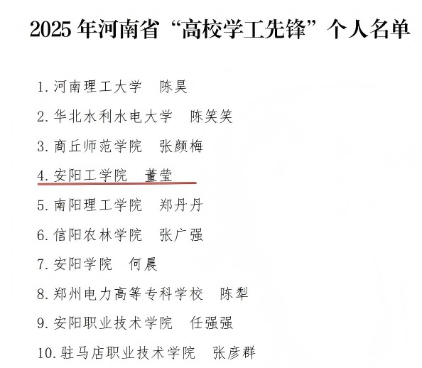 近日,中共河南省委宣传部、河南省教育厅公布了2025年河南省“高校学工先锋”评选结果。我校辅导员董莹获评“高校学工先锋”荣誉称号。