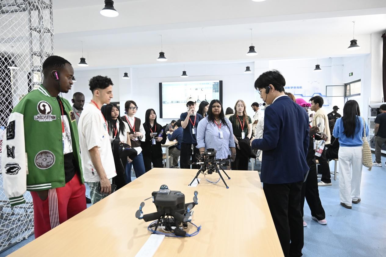 研学团由来自全省30所高校的158名中外学子组成,其中包含来自全球34个国家和地区的105名留学生。研学团先后参观学校无人机综合实训中心、航空综合实训中心和文化展览馆,沉浸式体验我校航空科技与传统文化交融共生的育人魅力。