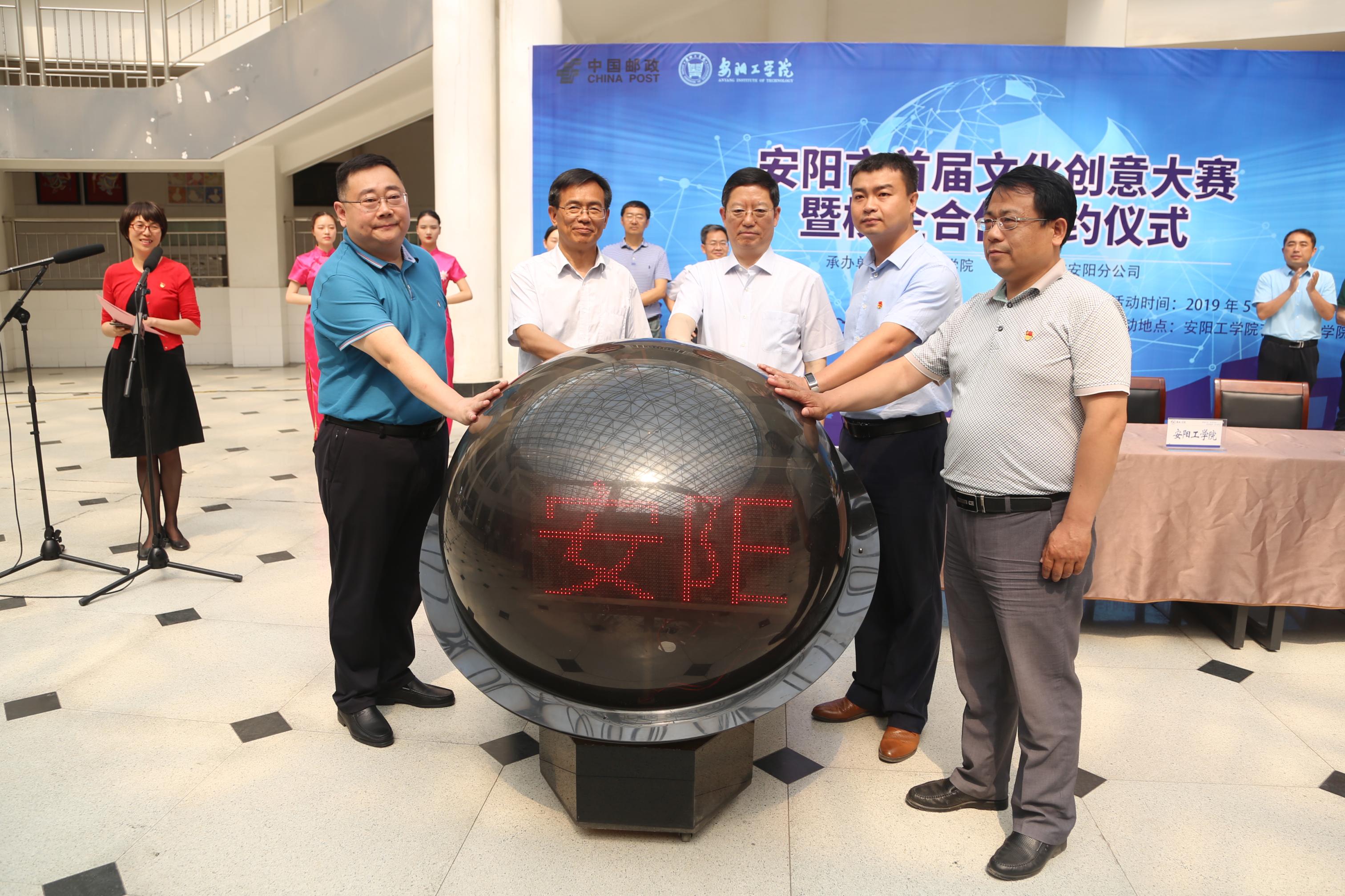 仪式最后,安阳市市委宣传部副部长张健、共青团安阳市委副书记元浩、安阳市文化广电体育旅游局副局长李齐越、中国邮政集团公司安阳分公司总经理程豪岭和校长景国勋共同启动了安阳市首届文化创意设计大赛。