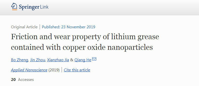 近日,由机械工程学院副院长何强博士指导的我校与河南科技大学联合培养的硕士研究生郑博撰写的论文《Friction and wear property of lithium grease contained with copper oxide nanoparticles》被国际知名SCI期刊《Applied Nanoscience》(中科院二区)收录,将作为封面文章进行推荐。