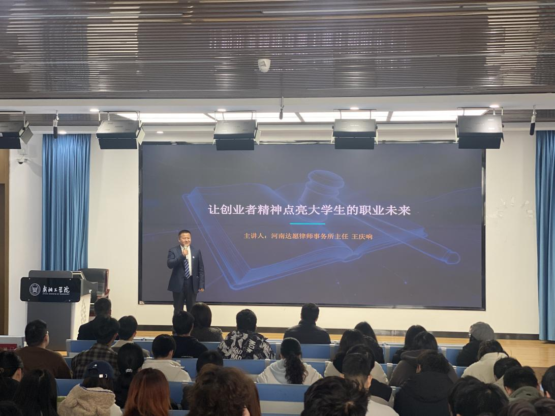 3月20日,创新创业学院、笃行书院在A02-202成功举办第二十五期“双创之声”暨“校友大讲堂”活动。邀请我校2011届毕业生、河南达愿律师事务所主任王庆响重回母校,向同学们讲述创业故事、分享宝贵经验。创新创业学院、笃行书院院长阎利、校友办相关工作人员以及来自各学院的160余名学生参加。