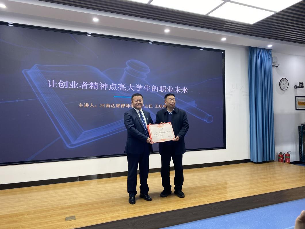 活动中,阎利首先向王庆响颁发了创新创业导师聘书。随后,王庆响以“让创业者精神点亮大学生的职业未来”为主题,分享了自己的创业经历与心得体会。