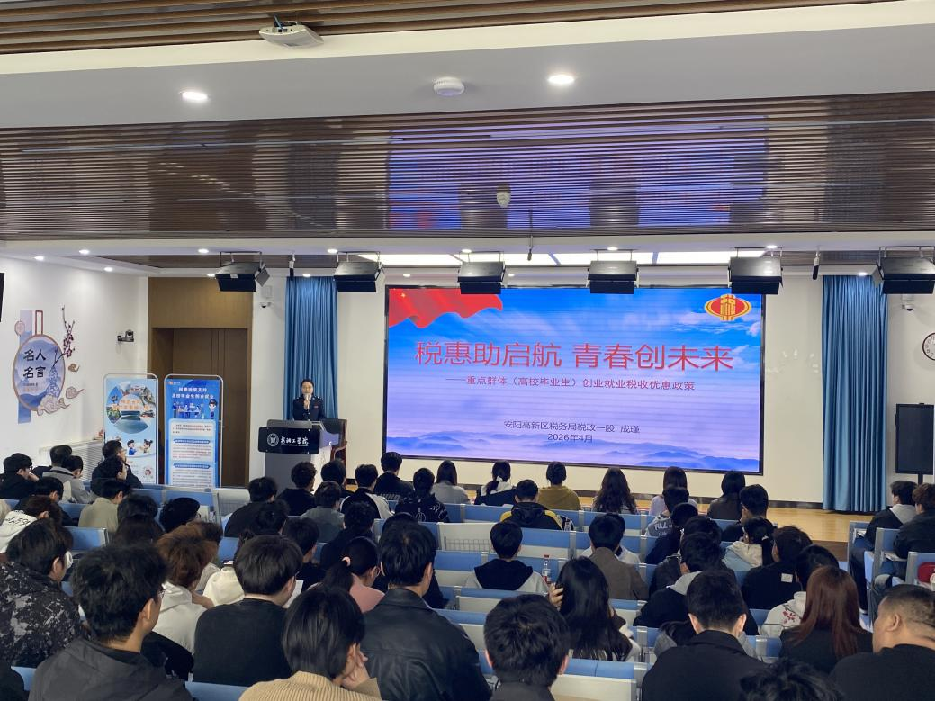 活动中,来自安阳市高新区税务局的3名工作人员分别以《高校毕业生创业就业税收优惠政策》《支持小微企业健康成长的税费优惠政策》《税收风险防控指南》为主题,详细介绍了相关政策要点,并结合典型案例深入剖析了各项政策在具体场景中的应用,梳理了企业或个人在享受政策过程中可能遇到的问题及解决方案,切实帮助大家更好地运用税收政策助力自身创新创业实践。在现场问答环节,同学们参与热情高涨,踊跃举手答题,现场气氛活跃。
